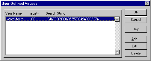This dialog box allows you to add, change or delete specific search strings that will become a part of the search criteria during a scan. In general, it is best to enter information in this dialog box only when instructed by Technical Support.